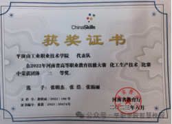 学院积极选拔学生参加技能大赛。2023年6月参加河南省教育厅组织的化工生产技术技能大赛,获得团体三等奖;2023年9月参加中国煤炭协会、中国化工教育协会联合举办的煤炭清洁利用技能大赛,获得团体三等奖。近年来,随着国家发展战略调整和河南省产业结构优化调整的进一步推进,化工行业人才迫切需求,就业形势好,毕业生供不应求。随着中国尼龙城的建设、化工行业快速发展,新建化工项目大量上马——尼龙新材料、新工艺不断发展,标志着化工市场产品市场广阔,蕴藏巨大商机,化工专业人才需求与日俱增。目前,尼龙科技公司、聚碳新材料公司、首恒新材料公司等一大批新建、扩建化工企业急需化工专业人才,我院已同河南神马尼龙化工公司、尼龙科技公司联合开办“应用化工技术专业新型现代学徒班”,与福建恒申集团、中国平煤神马集团签订协议,组建“恒申订单班”与“平煤神马订单班”,实现了校企优势资源共享,共同提升了专业的办学质量。高质量、特色鲜明的人才培养,不仅提高了人才培养质量,同时也大大提升了学生的就业竞争力,吸引了福建恒申集团、河南晋开化工投资控股集团有限责任公司、中国平煤神马聚碳材料有限公司、氢化学有限公司、平顶山市东鑫焦化有限责任公司、隆基绿能科技股份有限公司等来校招聘。